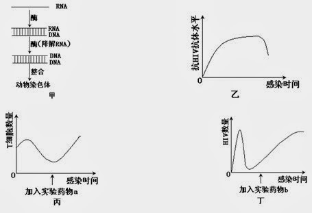 4.示意图甲、乙、丙、丁为某实验动物感染HIV后的情况( ) (A)从图甲可以看出,HIV感染过程中存在逆转录现象 (B)从图乙可以看出,HIV侵入后机体能产生体液免疫 (C)从图丙可以推测,HIV可能对实验药物a敏感 (D)从图丁可以看出,HIV对试验药物b敏感