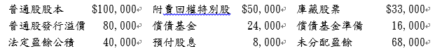 有5%累積部分參加至8%之特別股30,000股及普通股70,000股,每股面額均為$10;01~04年各年可分配股利為:$0、$7,000、$32,000、$78,000,求算04年「特別股」可分得之股利。