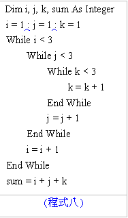 【已刪除】27. 承上題,K+J的值為何?(A)17 (B)16 (C)12 (D)14 N = 0 For I = 1 To 50 If I Mod 17 = 0 Then N = N + 1 End If Next I I = a Do While I < b Debug.Print("*") I = I + c Loop a = 27 : b = 15 : x = a : y = b Do Until a = b If a > b Then a = a - b If a < b Then b = b - a Loop MsgBox((x / a) & "/" & (y / a)) For I = 1 To 3 For J = 2 To 5 Step 3 For K = 1 To 4 S += 1 Next K Next J Next I (程式八) (程式九) (程式十) (程式十一)