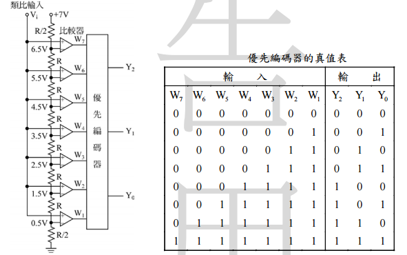 9.如下圖所示之電路為A/D轉換器,若類比輸入電壓Vi為 3.8V時,則數位輸出(Y