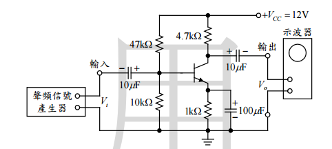 14.如下圖所示之電路中,已知電晶體工作在線性區,輸入訊號為 10kHz正弦波,逐漸增加輸 入訊號的振幅,在不失真條件下,由雙軌示波器顯示出V0與Vi之相位關係如何?又把電晶 體的射極旁路電容器拆離電路,則電壓增益的變化如何? (A) V0與Vi同相,電壓增益會變 大 (B) V