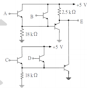 10.如右圖所示之電路,已知所有電晶體VBE = 0.7 V、 β= 50,則A、B、C、D均為0 V時,E之電壓約為多 少?