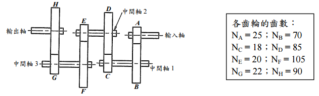 【已刪除】三、試說明何謂簡單齒輪系(simple gear train)、複式齒輪系(compound gear train), 並說明圖示的齒輪減速裝置屬於那一種?(10 分)若輸入軸的轉速為 1600 rpm,試 求輸出軸之轉速。(10 分)