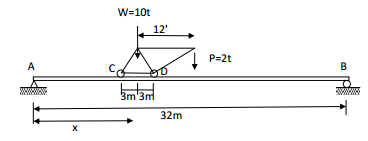 【已刪除】三、如圖示之輪車重 10 t,吊載 P=2 t,設輪車於梁上移動,求梁上之最大絕對彎矩。 (25 分)