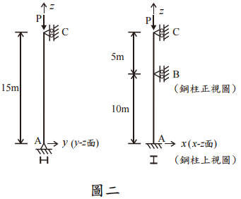 【已刪除】三、長度 15 m 之鋼柱承受軸壓力 P 作用,柱底及柱頂之邊界條件,如圖二所示。今於 柱中 B 點處 x-z 面上設置鉸接之側向支撐以防止側移,且已知此鋼柱承受靜載重 30 tf 及活載重 80 tf。若此鋼柱採用 W14 68 型鋼,使用理論 K 值,試以容許應力設計 法(ASD),檢核此鋼柱是否滿足設計規範之安全要求?(25 分) W14x68 鋼柱之材料性質及相關斷面尺寸如下所示: