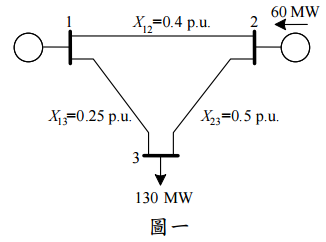 【已刪除】二、圖一為一具有 3 個匯流排的簡化系統。請利用直流電力潮流(DC power flow),求 得相位角 δ
