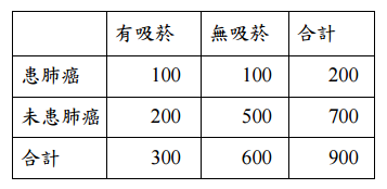 2. 某學者想探討有無吸菸和患肺癌的關係,他收集資料如下表。請依據下表資料, 算出有無吸菸患肺癌的勝算比=? (請列出計算式,否則不計分)