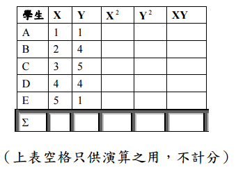 三、隨機抽取 5 名學生,得其焦慮(X)與數學(Y)分數資料如下表。