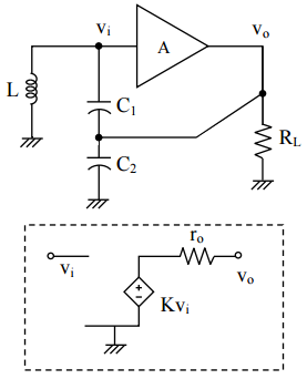 【已刪除】四、如下圖所示為一考畢子振盪器(Colpitts Oscillator)電路,點線框內為放大器 A 的 等效電路。求振盪頻率以及維持振盪所需的最小 K 值,以 r