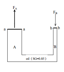 【已刪除】五、下圖中 A 與 B 兩圓管相連通,內部灌滿比重為 SG=0.85 之油。A 管直徑為 0.2 m, B 管直徑為 0.05 m。今於 B 管上端面 b-b 處施予 FB=100 kN 之作用力,應用巴斯卡 定律(Pascal’s law),請計算 A 管上端面 a-a 處所承受之作用力 FA為何?(20 分)