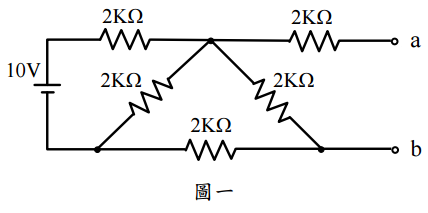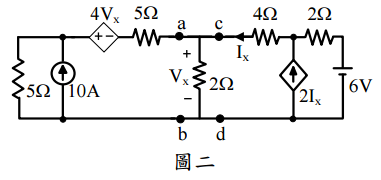 求圖一電路之戴維寧(Thevenin)等效電路。(12 分)