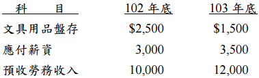 【已刪除】一、臺北公司 102 年底及 103 年底調整後試算表相關科目餘額如下: