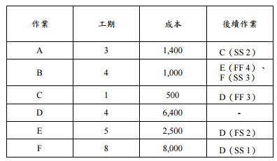【已刪除】三、某工程作業資料如下,請: (1) 畫出網圖,找出要徑,畫出最早、最晚時間之成本曲線圖(點出第 5 天的最早、 最晚時間金額)。(15 分) (2)計算各作業之最早、最晚時間、總浮時、自由浮時,將結果做成一表。(10 分)