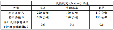 【已刪除】五、寶生農場計劃在兩種新稻米品種 A 與 B 之間,選擇種植其中之ㄧ,下表為在不同天 候情況下之預測產量: