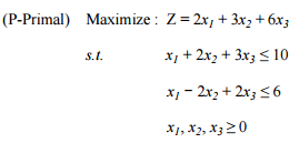 請寫出對偶問題(Dual problem)、以單型法(Simplex method)求解原型問題(P)之 最佳解,在每一計算表中(Tableau),指出對應對偶問題中之變數值與其違反之 限制式,並於最佳解表中,驗證互補條件(Complementary slackness conditions)。