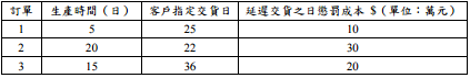 【已刪除】四、台合精密機械公司收到 3 個客戶訂單,其生產時間、客戶指定交貨日(假設生產計 畫起始日為第 0 日)及延遲交貨之日懲罰成本資料如下表: