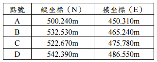【已刪除】一、於一礦區內已知導線點 A、B 及道路中心樁 C、D 四點坐標如下表,今欲放樣道路中 心樁 C、D 二點,放樣作業時將於 A 點架設儀器,請計算放樣作業所需要之數據。 (20 分)另 C 點高程為 150.33 m,D 點高程為 151.41 m,請計算其坡度。(5 分)