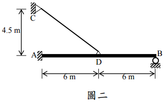 【已刪除】二、如圖二所示之複合結構,AB 構件為梁結構,A 點為固接支承,B 點為滾支承;而 CD 構件為軸力桿件,C 點為鉸支承,且 D 點與梁交接處為外部鉸接。另外,AB 構件之彈性模數與慣性矩乘積為 E