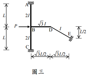 【已刪除】三、如圖三所示之剛架結構,其 A、C 與 E 點均為固接支承,同時每根構件之彈性模數 均為常數值 E; AB、BC、BD 及 DE 四根構件之長度分別為 L、L、 √3 L/2 與 L (L = 8m),而慣性矩分別為 2I、2I、 √3I 與 I。當 B 點承受水平向右集中載重 P = 66 kN 時,請以傾角變位法計算 A、B、C、D、E 各點彎矩。(若以其他方法計算 不予計分)(25 分)