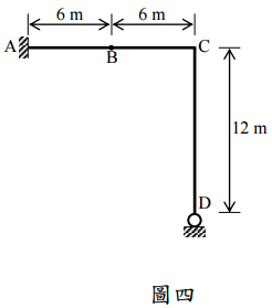 【已刪除】四、如圖四所示之剛架結構,其 A 點為固接支承,D 點為滾支承,構件 AC 與 CD 之彈 性模數與慣性矩乘積分別為 EI 及 2EI,且 EI = 1000 kN-m