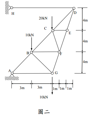 【已刪除】二、一平面桁架承受載重如圖二所示,試求桿件 DE、CF、BC 及 CE 之內力。(25 分)