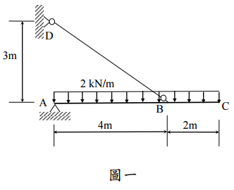 【已刪除】一、圖一結構點 A 為鉸接,點 B 連接一軸力桿 BD,此結構桿件 AB 及 BC 承受一垂直 於桿件之均佈載重 2 kN/m。設桿件 AB 及 BC 斷面 EI= 2000 kN-m2,桿件 BD 斷面 EA= 200,000 kN。若不考慮桿件 AB 及 BC 軸向變形,試用單位力法,求點 C 之垂 直位移(25 分)
