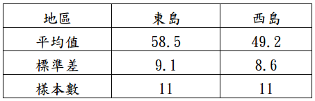 【已刪除】四、某海洋生物學家想瞭解不同海域所捕捉到的鱸魚長度(公分)是否有不同,分別在 東島海域及西島海域各捕捉 11 條鱸魚,得到下列資料: