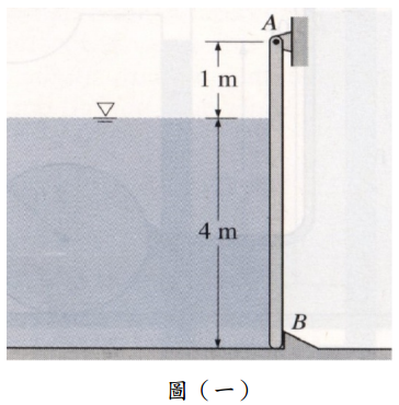 一、如圖(一)所示,長方型閘門,高 5.00 m,寬(垂直紙面方向)6.00 m,水深 4.00 m。 閘門可繞 A 點旋轉。擋塊 B(其高度可以忽略)可提供水平方向之力 F