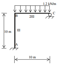 【已刪除】四、所示剛架結構 A 為固接支承,C 點為滾支承。BC 桿件承受均佈載重 w=1.2 kN/m, 如圖所示。各桿件之 E 均相同。桿件 AB 面積慣性矩為 I,桿件 BC 則為 2I。請以 彎矩分配法分析各桿件端點彎矩。使用其他方法不予給分。(25 分)