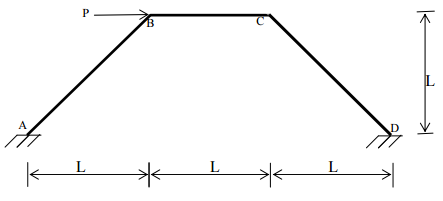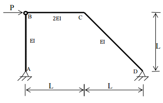 【已刪除】二、所示剛架結構 A、D 為鉸支承,B 點為鉸接。在 B 點施加水平載重 P,如圖所示。 各桿件之 E 均相同。桿件 AB、CD 面積慣性矩為 I,桿件 BC 則為 2I。請推算支承 A 之轉角。方法不拘。(25 分)