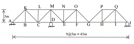 【已刪除】一、請繪所示桁架結構支承 A, D, J 之垂直反力與桿件 EO, FO, EF 桿件力之影響線。向 下單位力 1 kN 在 A 至 J 移動。各節點皆為鉸接。(25 分)