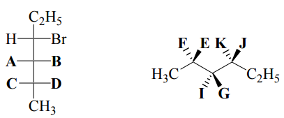 【已刪除】二、試於下列費雪(Fisher)投影及立體結構式中字母 A 至 K 填寫正確的取代基,使其 成為(2R, 3S, 4S)-3,4-二溴-2-己醇之結構。(10 分)