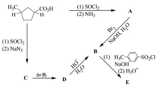 【已刪除】八、下列反應流程圖中,請寫出各中間產物及最後產物 A 至 E 的結構式。(10 分)