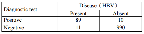 請由表列資料,計算 B 型肝炎盛行率、陽性預測值、陰性預測值、診斷靈敏度、診 斷專一性、陽性概似比(positive likelihood ratio)以及陰性概似比。(14 分)