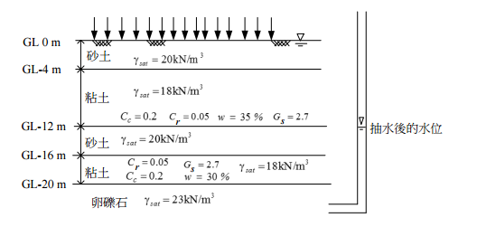 【已刪除】一、如下圖所示之沖積土地層剖面圖。從地質形成的歷史推論,第二層粘土和 第四層粘土的性質相似;第一層砂土和第三層砂土的性質相似。地下水位 位於地表面,各土層的水壓力處於靜態水壓狀態(hydrostatic condition), 且均處於正常壓密狀態。圖中的符號如下:sat 代表飽和單位重,w 表含水 量,Gs 代表土粒比重,Cc 代表壓縮性係數,Cr 代表回脹係數。由於民生用 水的需要,曾經長期抽取 GL-20 m 下方卵礫石層的地下水,致使卵礫石層 的地下水位降至 GL-12 m,並且維持在這個水位相當長的時間;現地觀測 顯示,GL-16 m 上方的水位仍然不變,也就是仍然在地表面。後來政策改 變,不能再抽取卵礫石層的地下水,地下水因而再度上升至地表面。今取 8 m 處的粘土進行系列的三軸壓縮試驗,得到三組土壤強度參數如下:三 軸不壓密不排水(UU)試驗,c =16.2 kPa, φ=0;三軸壓密不排水(CU) 試驗,c =0, φ=15