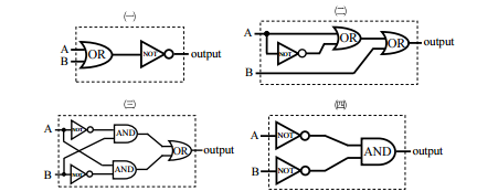 【已刪除】一、如下 4 個邏輯線路圖所示,每個線路圖均有兩個輸入值 A 和 B,及一個輸出值,請在下 列(a)到(f)的六個選項中,選出一個正確敘述各邏輯線路圖的功能。(8 分)