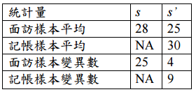 【已刪除】在低收入戶中若面訪戶之樣本為 s,其中記帳戶樣本為 s’ (s’為 s 之子集合),以下 為樣本統計量(均以仟元為觀察單位):