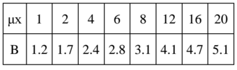 Co 點射源的等效劑量增建因 ρ 數(buildup factor, B)和鬆弛長度(relaxation length, μx)的關係如下表,試問須使 用多厚的鉛屏蔽,才能使距離該射源 5m 處的等效劑量率成為 0.1 mSv/h?(20 分)