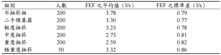 【已刪除】四、某研究者欲探討抽菸對肺功能之可能危害,研究者量測 FEF(l/s)做為肺功能之指 標,其結果如下表。請問不同吸菸組別肺功能是否不同(α= 0.05)?(20 分)