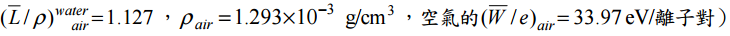 Farmer-型游離腔(Farmer-type ionization chamber)置入水假體中,以 平衡厚度的等效組織為腔壁,以醫用直線加速器輸出 10 MV 的 X 光射束的照射 50 秒,測得電容為 30 pF,受照射後跨過游離腔的電壓差為 104 V,則水的吸收劑量率 (以 cGy/min 為單位)為何?(截止能量 Δ 為 10 keV 的水對空氣的平均限制阻擋本領 比為
