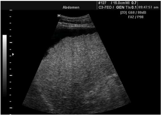 一位50歲男性因為腹脹做腹部超音波檢查呈現如下圖,則下列敘述那一項最正確? (A)右側腎臟結石,合併輕微腎水腫(hydronephrosis) (B)肝臟呈現不均勻回音,合併腹水(ascites) (C)脾臟腫大,合併脾靜脈鼓脹(splenic vein engorgement) (D)胰臟發炎,合併胰管擴張(pancreatic duct dilatation)