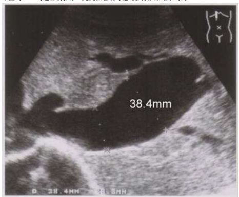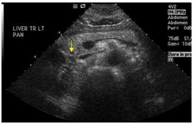 67.57歲女性病人,上腹部橫向超音波掃描如下圖,箭號所指最可能為何?