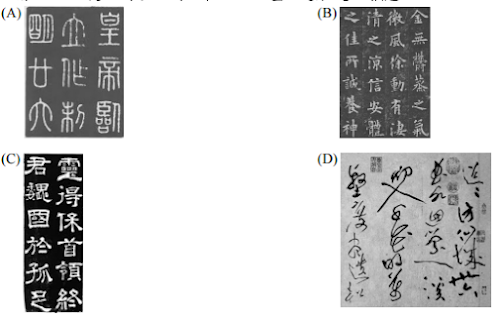 下列書法字體何者最符合「浩乎如行雲,倏乎如流電,如驚蛇,如遊龍,意態橫出,不主故常,當使人心動目眩,而莫知其然也。靜而察之,無一畫之違理」之描述?