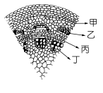 10614 一般木本植物莖內維管束中形成層的細胞可以不斷分裂,產生新的木質部和韌皮部,使莖不斷 加粗,於是莖內含有(甲)新的木質部(乙)新的韌皮部(丙)老的木質部(丁)老的韌皮部。它們「 由外至內」的順序應為何? (A)(甲)(乙)(丙)(丁)(B)(乙)(丁)(丙)(甲)(C)(丙)(甲)(乙 )(丁)(D)(丁)(乙)(甲)(丙)。