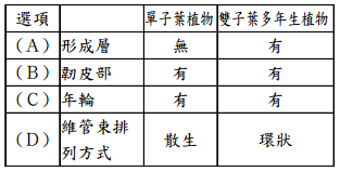 (A) 形成層 無 有 (B) 韌皮部 有 有 (C) 年輪 有 有 (D) 維管束排