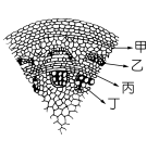 (A)此木材為形成層向外生成的韌皮部(B)甲的細胞為秋 冬季節產生(C)甲的細胞比乙的細胞大(D)甲的功能是運輸養分。
