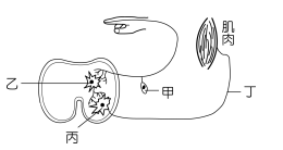 (A)甲神經的訊息傳遞方向為指尖向 脊髓(B)丁神經的訊息傳遞方向為肌肉向脊髓(C)此反應動作由大腦控制(D)人會感覺到痛 ,是因訊息傳遞到脊髓。