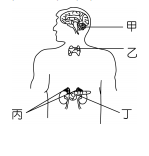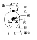 (5)「阿亮在巷口突遇惡犬,他拔腿就跑,半分鐘內即達家門」此為圖中何種腺體所發揮的功 能? (A)甲(B)乙(C)丙(D)丁。
