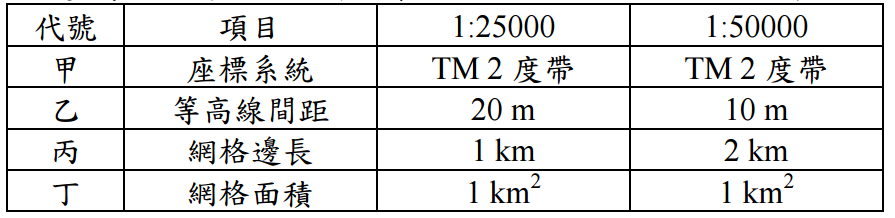21. 涵蓋全臺灣的經建版地形圖,有 1:25000 和 1:50000 兩個版本。下列關於兩者的比較,何者正確?