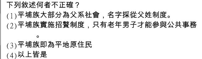 【已刪除】2以下為太平國小社會學習領域段考有關平埔族歷史與文化的試題: